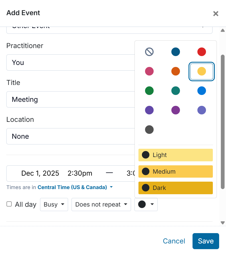 From the calendar, at the time of event creation, you may assign any custom color to that event. On the Add Event modal, you may select the color you wish to use to display the event on the calendar. Click the colored-circle by the repeat options to select the color. If you select a recurring appointment, the color will persist through future appointments.