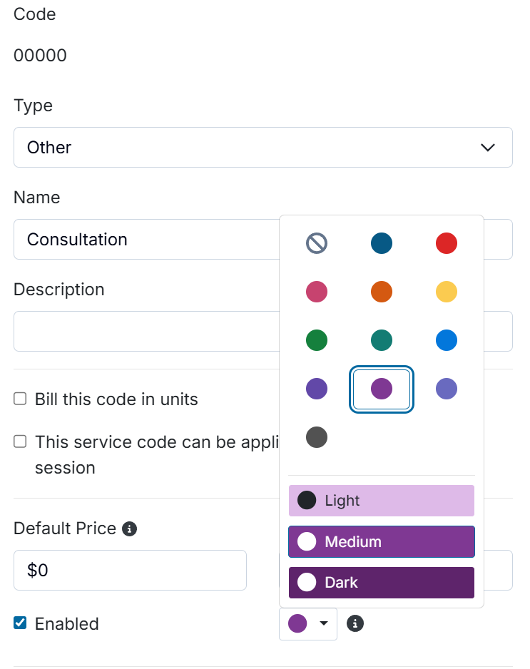 Click the '...' menu for any service to edit. From there, you may set any service code to be displayed with one of many color options. Click the colored-circle to select a color from the color options. The selected color will be the default color for new appointments using that service.