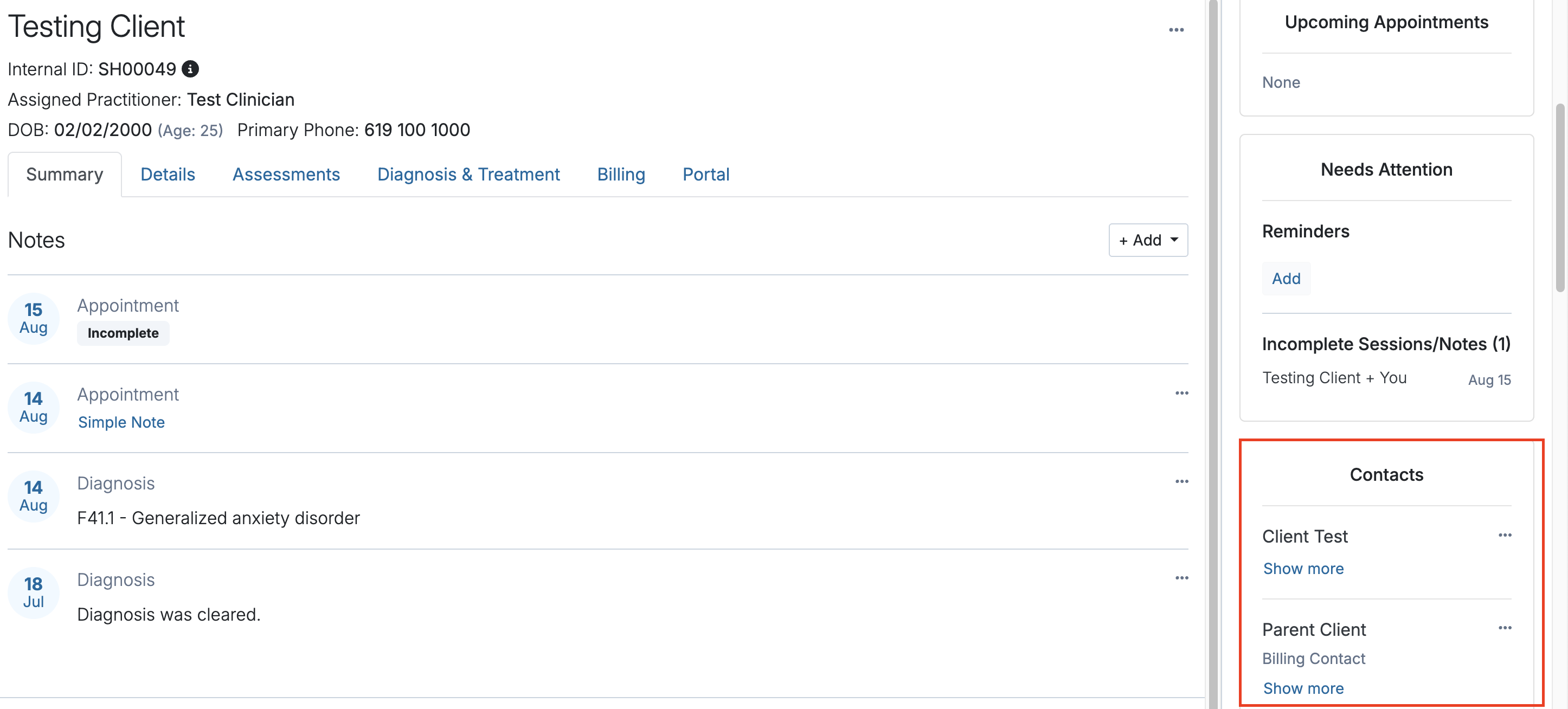 If you activate the contact, they will become an active client and you will then see additional tabs such as Diagnosis and Treatment Plan. This can be helpful when a clinic is working with minors and their parents. The parents may be clients, but also be the emergency contact for their minor children. This allows parents to have a separate portal while also serving as billing contacts for both their own therapy services and those of their minor children.