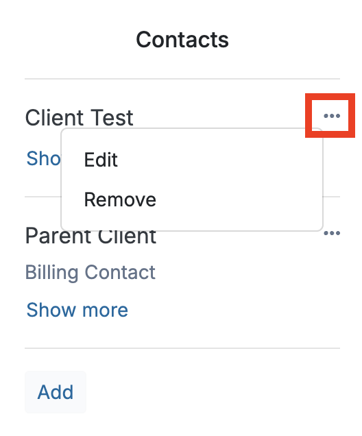 If you need to change, add, or remove a contact after you have created your contact, you can do so by by going to the client's chart, and on the right-hand panel, scroll down to the Contacts section.