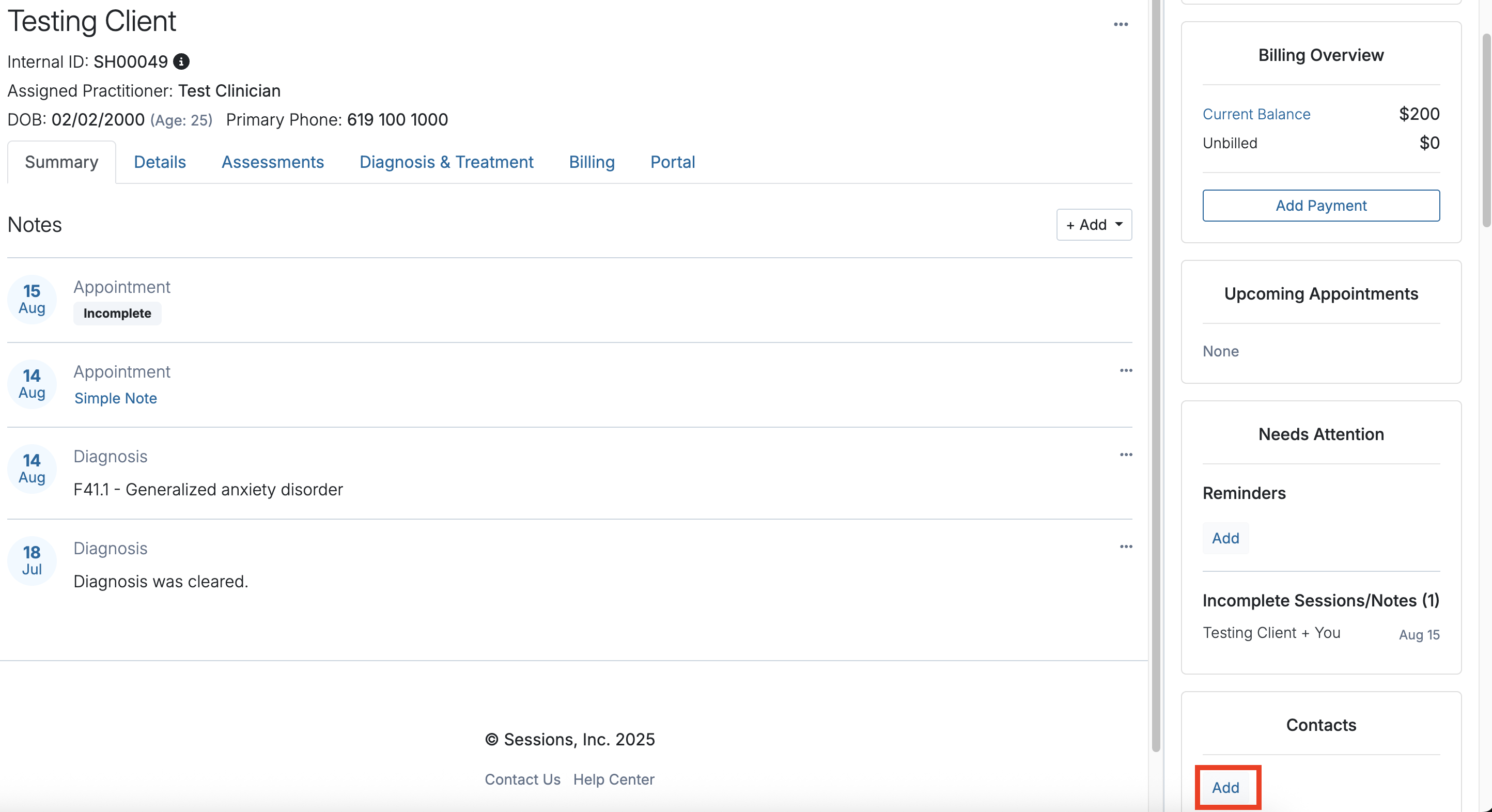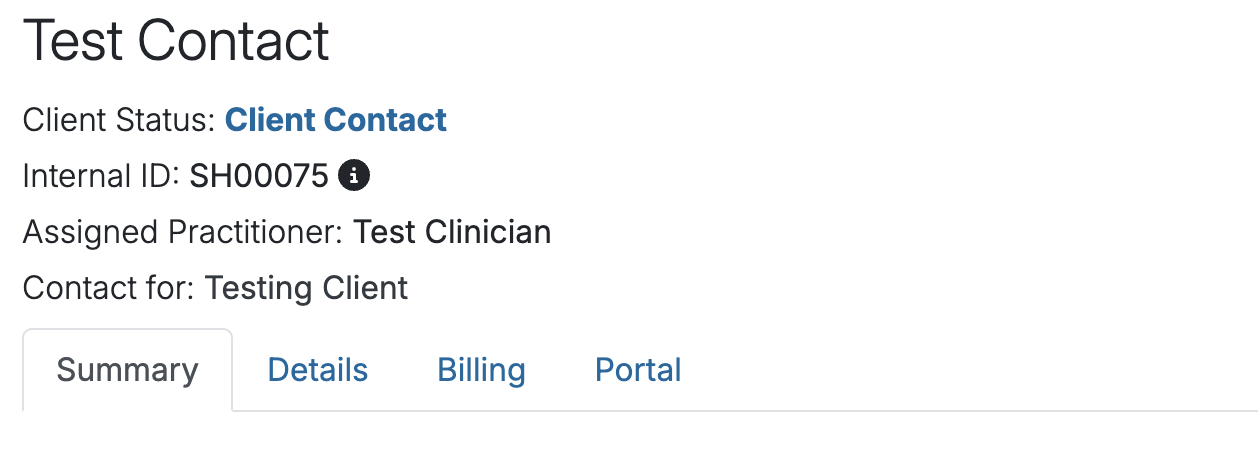 Newly added contacts who have never been active clients in Sessions Health will display a Client Status of Client Contact.