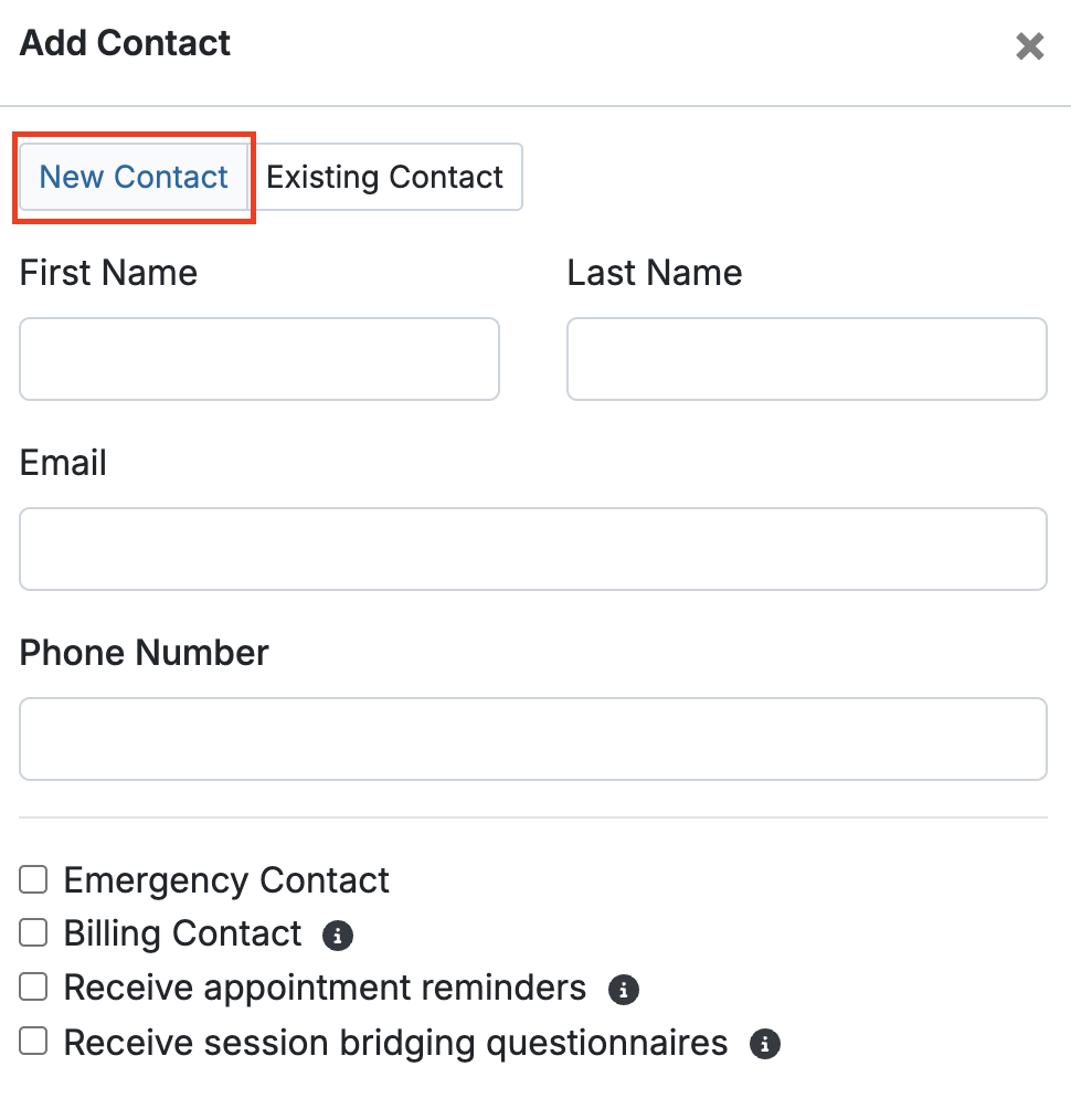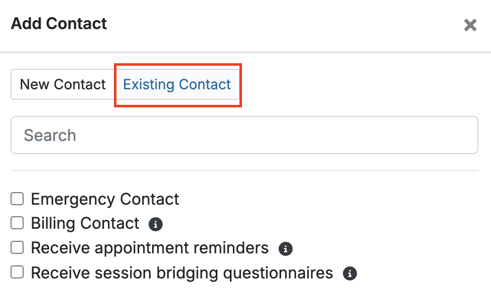 When you click Edit, you can assign the contact as a billing contact and/or emergency contact, as well as enable them to receive appointment reminders or session-bridging questionnaires.