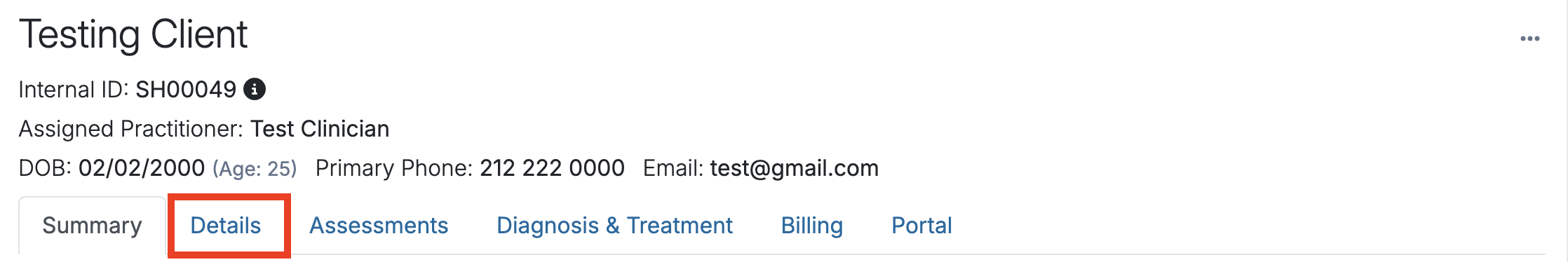 In the Details tab, you can edit information such as their name, email address, including managing customized reminder settings. Their billing settings and portal information can be managed on their chart as well.