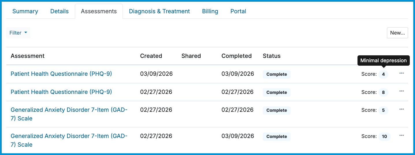 All completed assessments appear in the Assessments tab in the client’s chart, including scores and graphs.