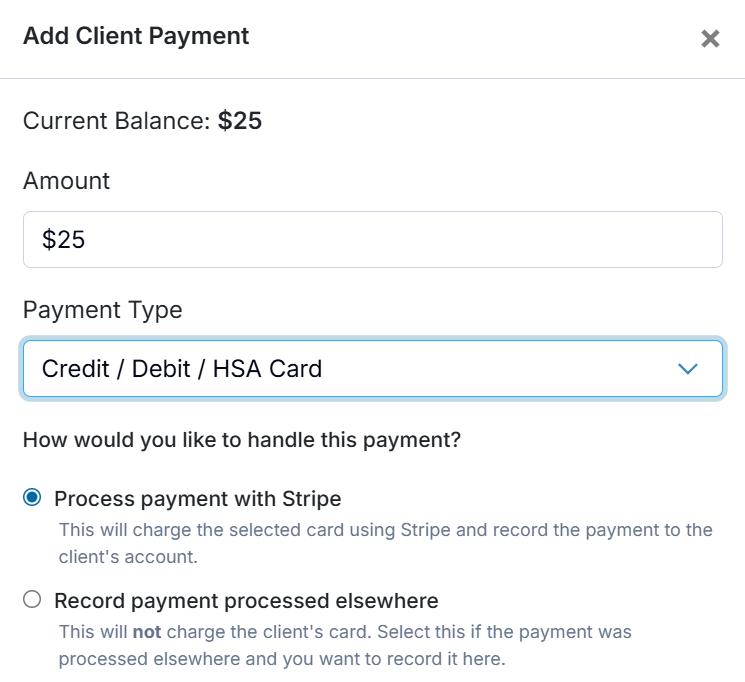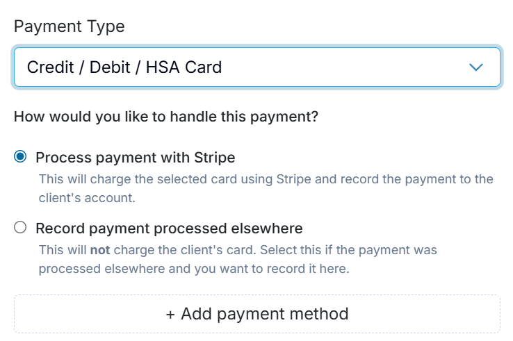 If Stripe is configured under Billing Settings > Online Payments, this option will charge the selected card through Stripe and automatically record the payment to the client’s account. If the client’s credit card is not already on file, you can click + Add payment method to manually enter it. Otherwise, the saved card will be available for selection.