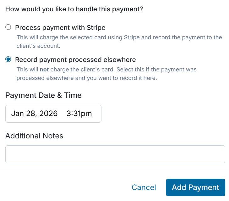 Use this option for payments that were collected outside of the system. This option will not charge the client’s card and will simply record the payment in the account. To add an offline payment, enter the date and time it was received elsewhere, include any notes for your records, then select Add Payment.