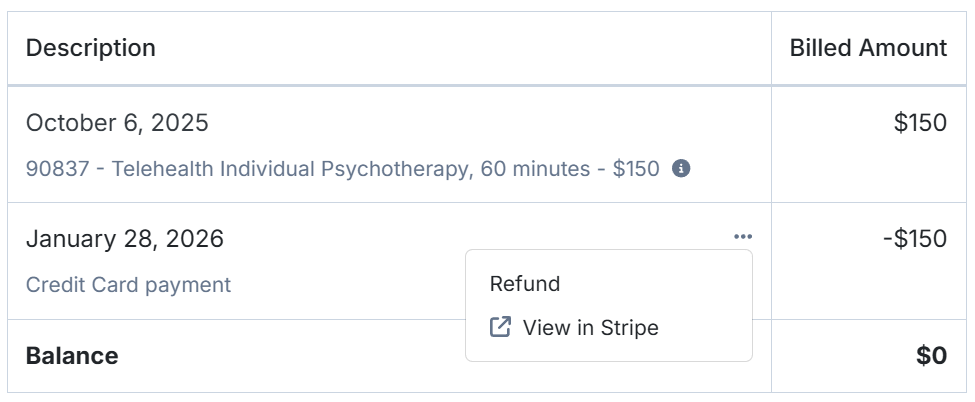 If you have collected an online payment, you can easily see the associated payment in Stripe. Click the '...' menu next to an online payment transaction on a bill. Click the View in Stripe link to be taken to the transaction in Stripe.