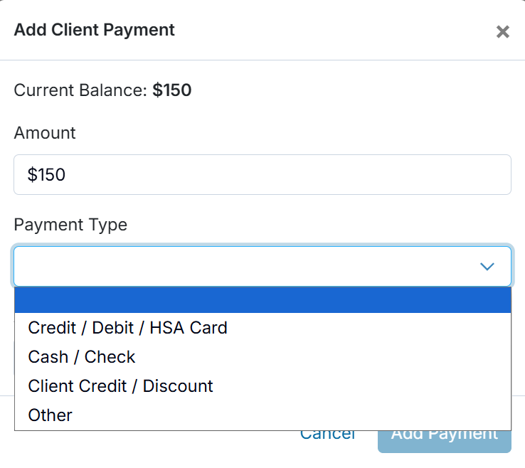 If the billing responsibility is Insurance, you'll be presented with an option to add the Client or Insurance payment. Otherwise, it'll take you through the client payment module. See Record an insurance payment article for details on insurance payments.