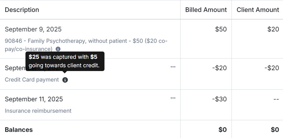 When a client’s copay is initially collected and later found to be higher than what insurance reimburses, the overpaid difference is automatically applied as a credit to the client’s account. The system also adjusts the corresponding bill to reflect this change.