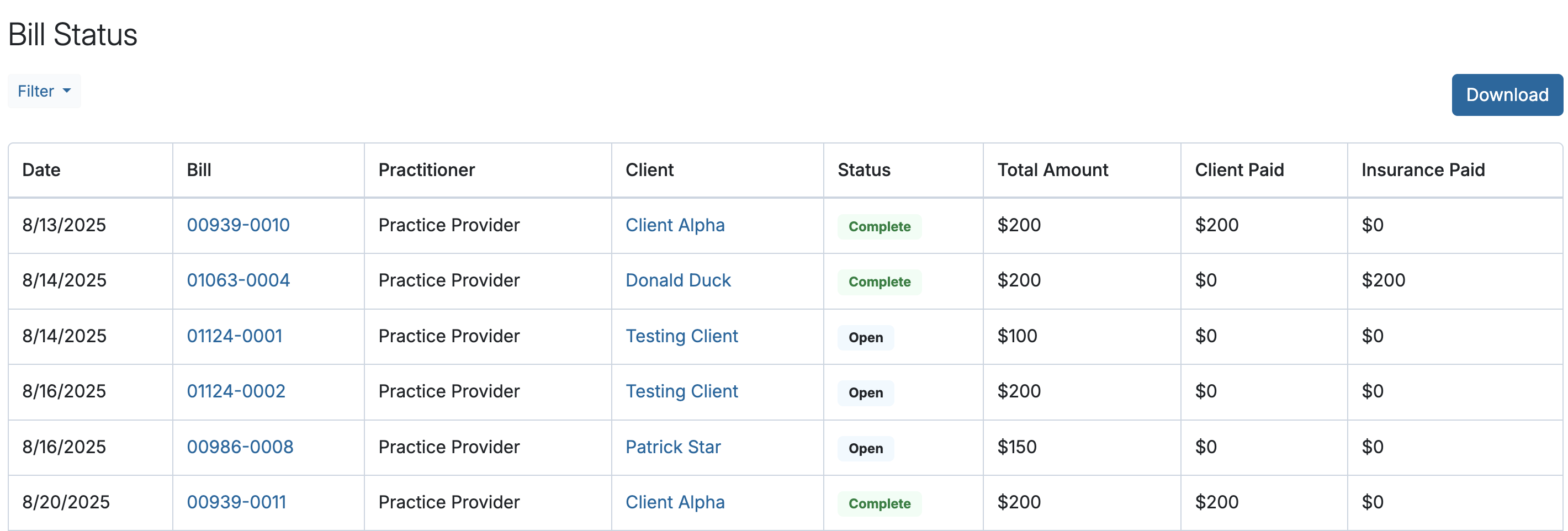 As with all Sessions Health insights reports, you can download the Bill Status report as a .CSV file by clicking Download in the top right hand corner.
