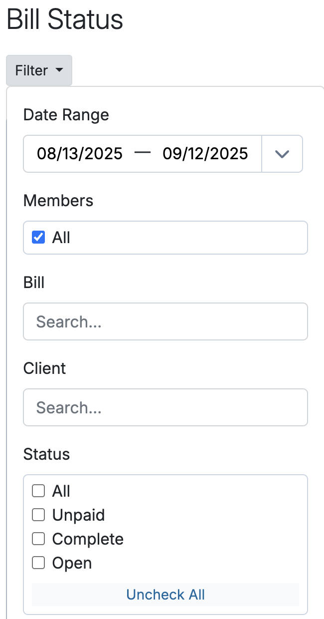 - Status: Adjust the report by All bill status or specific ones: Unpaid, Complete, Paid