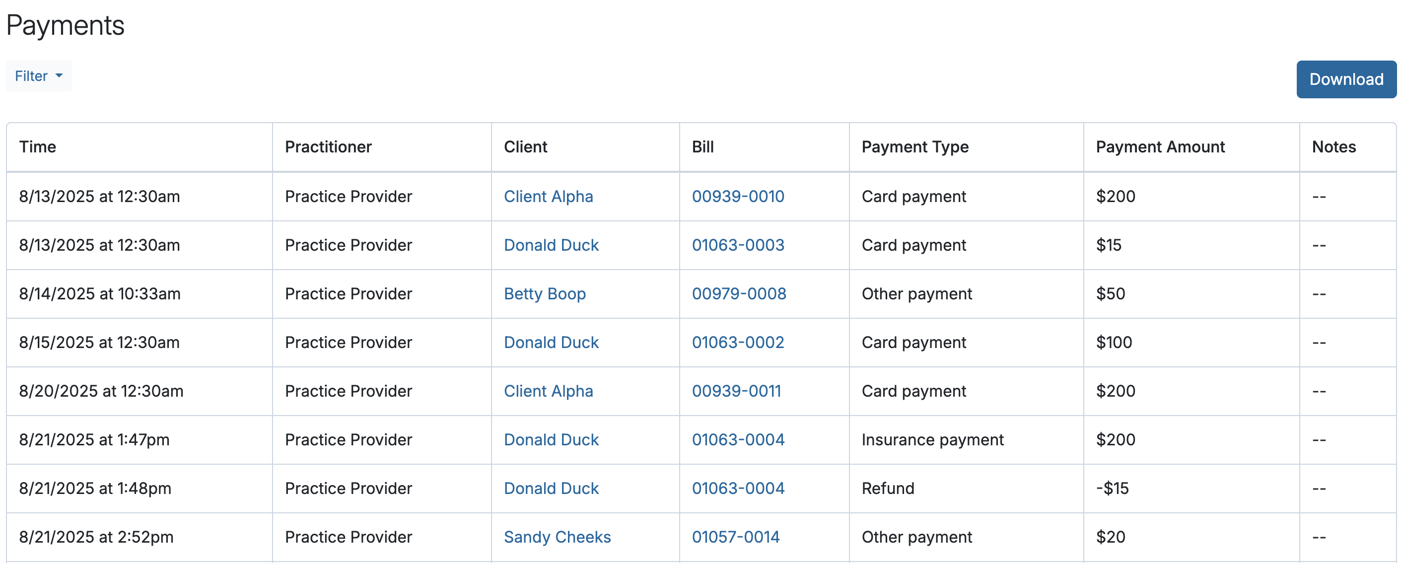 The payments report is a record of all payments and refunds entered into Sessions Health. Credits added or used for payments are not included in this report.