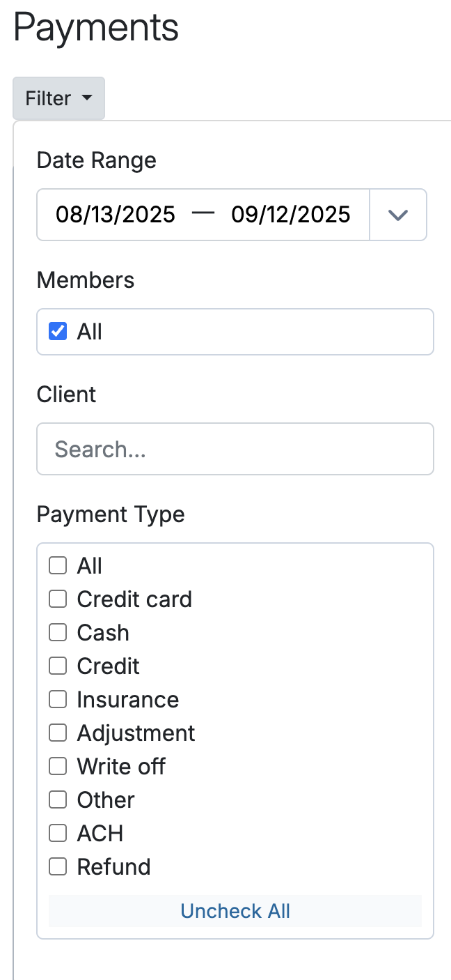 - Payment Type: Select the payment method(s) to include in the report by checking the appropriate box.