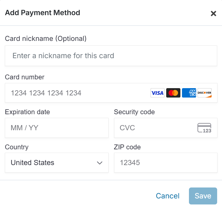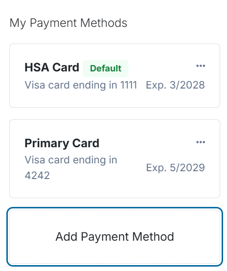 To add another credit/debit card, simply click Add Payment Method again and repeat the steps from the previous section. Additional cards will be listed under My Payment Methods in the order they're added.