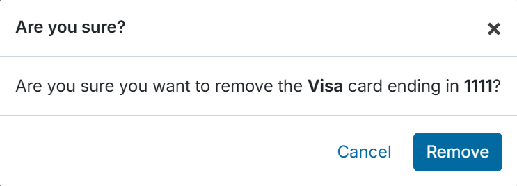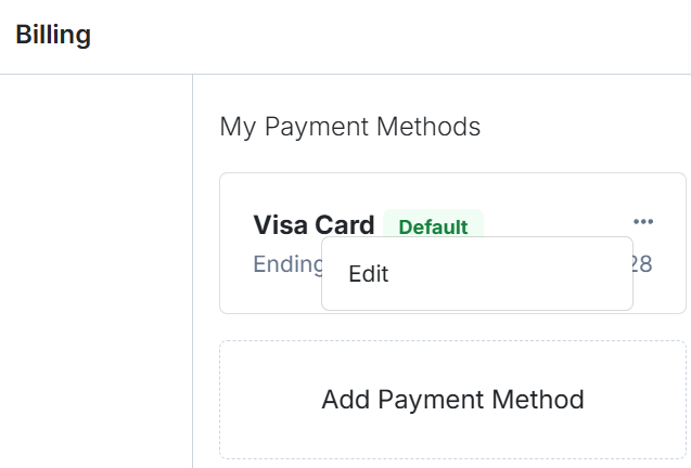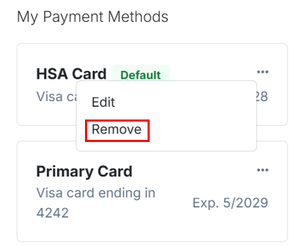 Once multiple cards are listed under the Billing tab > My Payment Methods section, a “…” menu will appear next to each card. To remove a card, click the “…” menu next to the card you wish to delete and select Remove. Confirm by selecting Remove again on the "Are you sure?" pop-up.