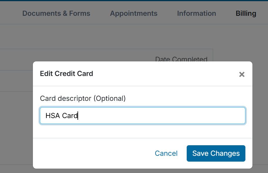 From the "Edit Credit Card" pop-up modal, enter your card's new nickname in the Card descriptor field, then click Save Changes.