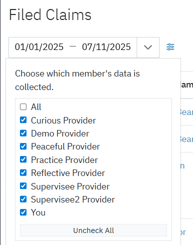 You can also filter claims by clinician using the Settings icon (three horizonal lines) to the right of the date range.