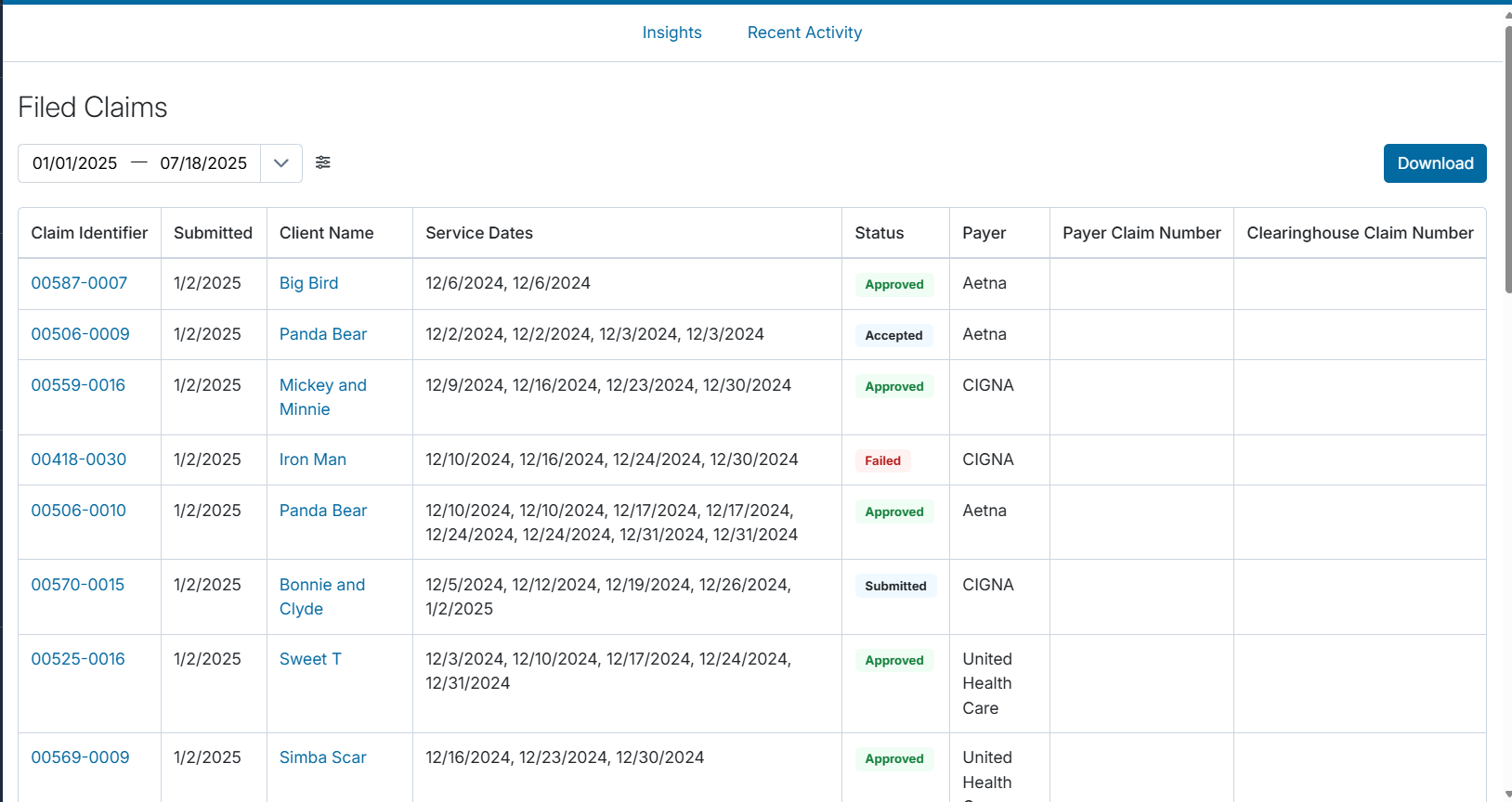 The Insights: Filed Claims page offers a comprehensive overview of your insurance claims that have been filed through Sessions Health. This report includes essential details such as the date of submission, client name, service dates on the claim, status, and payer.
