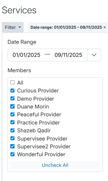 You can also filter services by clinician in the Members area. You can either select "All" clinicians on the account or choose specific clinicians by checking the boxes next to the names you’d like represented. Press "Uncheck All" to clear out your selections in bulk.