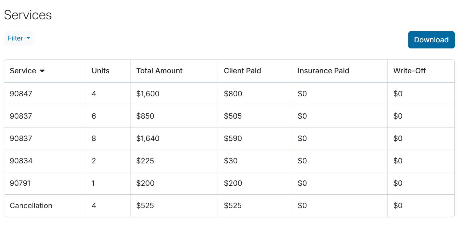 The Insights: Services page offers a summary overview of your income for each Service you use. This report includes details such as a custom service name or CPT code, number of units or times used during the selected date span, total charged amount for the period, and amount of payments or write-offs for these occurrences.