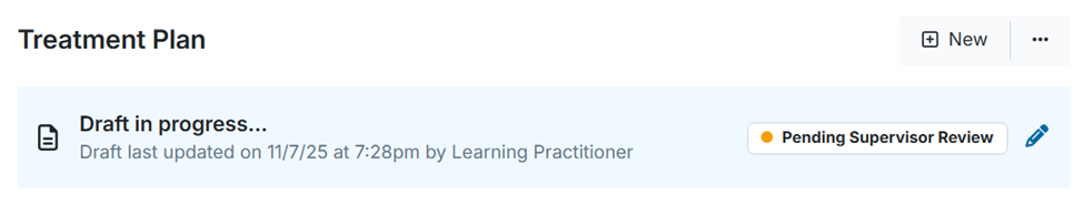 Completion by Supervisee: When a supervisee creates a treatment plan under the Diagnosis & Treatment tab, it is automatically assigned to their supervisor for review. They will see a “Pending Supervisor Review” banner.