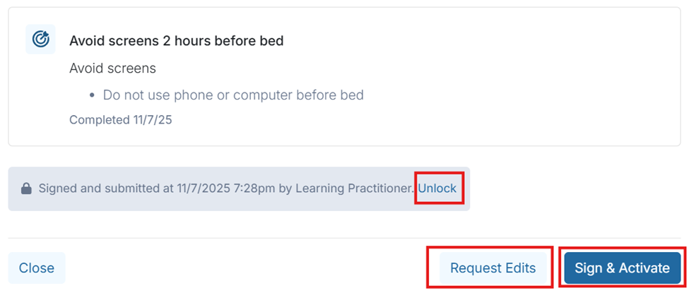 - Unlock: Removes the supervisee signature, requiring the supervisee to sign the treatment plan again. Unlocking the treatment plan will create an entry in the supervisee's Home > Needs Attention > Needs Revision section.