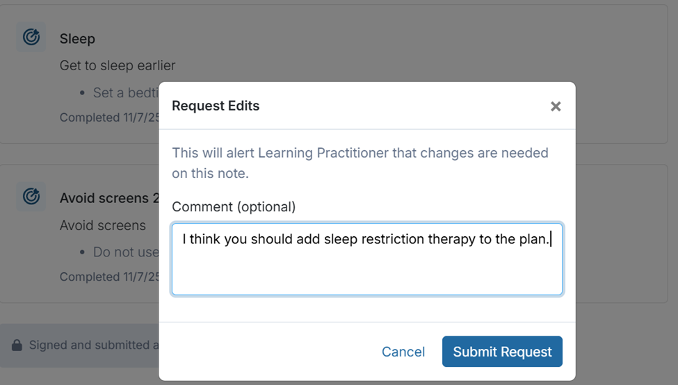- Request Edits: Supervisors can provide the supervisees feedback in real-time. Requesting edits will unlock the treatment plan and create create an entry in the supervisee's Home > Needs Attention > Needs Revision section.