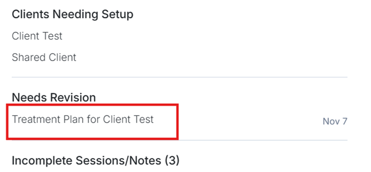 Needs Revision Status: If a supervisor unlocks the treatment plan or requests edits in the comments pop-up window, supervisees will see an entry in their Home > Needs Attention > Needs Revision section. The supervisor's comments will appear at the top of the treatment plan that needs to be revised, along with the comment date.