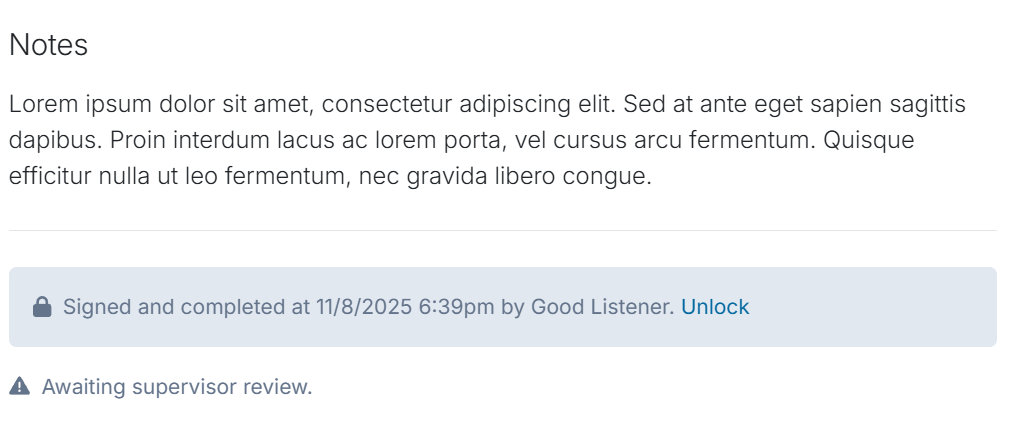 Note: Any notes signed by a supervisee before a supervisor was assigned will not be associated with the new supervisor. To associate these notes with the newly assigned supervisor, the supervisee must first unlock and re-sign the note. Once updated, the note will appear in the supervisor’s Needs Attention area for review.