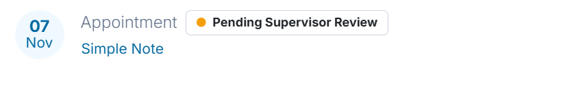 Once the supervision settings are configured, after a supervisee signs a progress note, the session note will display “Awaiting supervisor review” and a "Pending Supervisor Review" banner will appear in the appointment entry on the Summary page of the client's chart.