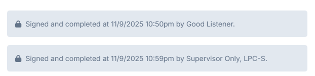 Lastly, after both the supervisor’s and supervisee’s signatures are applied to a progress note, the note will display a timestamp for each signature.