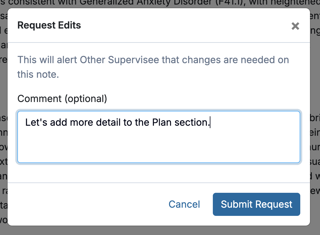 When Request Edits is selected, a modal will appear allowing a supervisor to enter comments to notify the supervisee that changes are needed. Once feedback is finalized, proceed to click Submit Request.