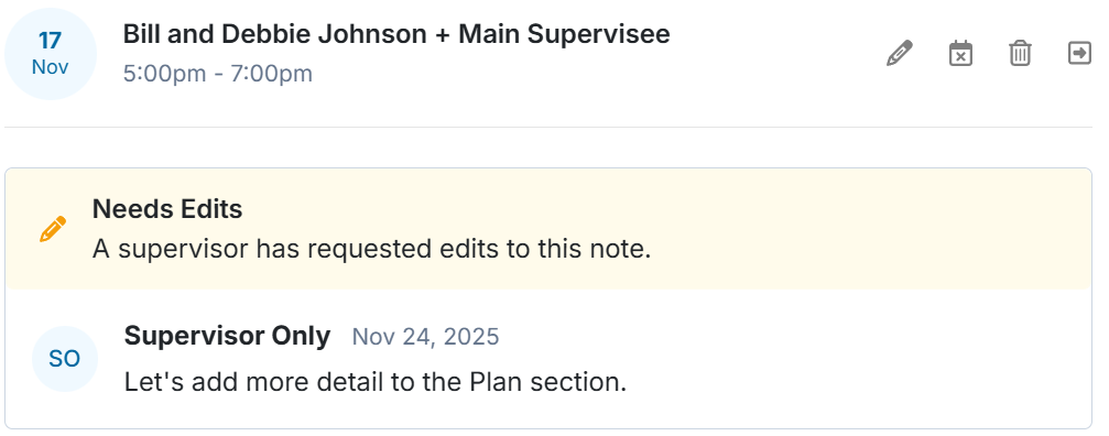 Next, a new notification will appear in the supervisee’s Home > Needs Attention > Needs Revision section, restarting the note-signing process. By clicking on the session link from the Needs Revision panel, the system will route to the client's session note, which will display a yellow Needs Edits status along with the content of the supervisor’s feedback.