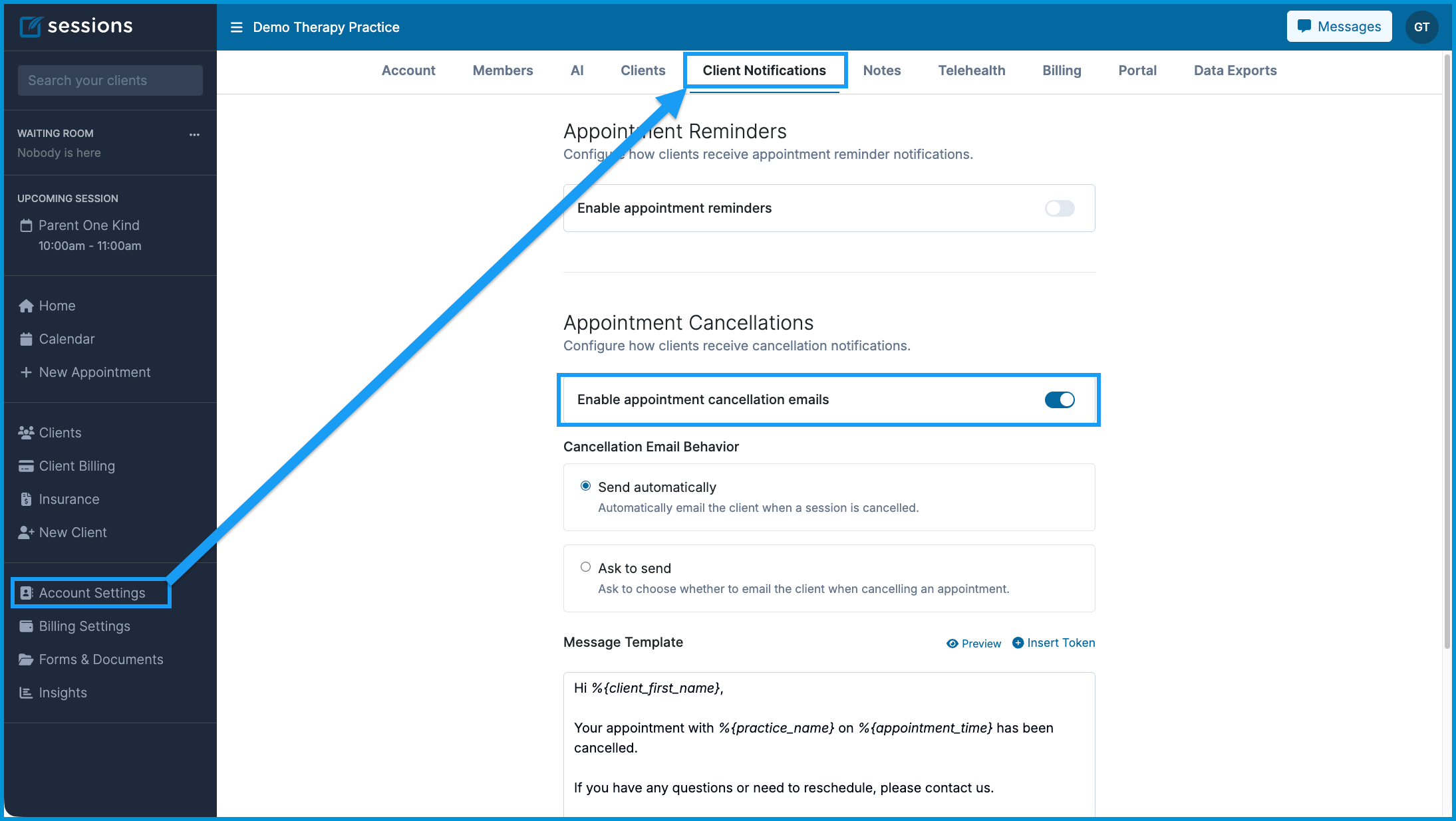 ℹ️ A client’s name combined with their appointment date and time may qualify as Protected Health Information (PHI). Sessions Health sends cancellation emails in a manner consistent with HIPAA privacy and security requirements.