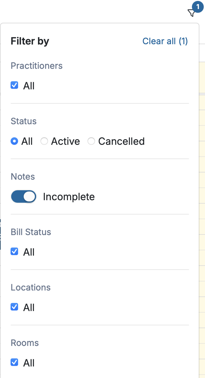 - Filter by Incomplete Notes: Toggle the Incomplete Notes button to on (highlights to blue) to quickly identify which appointment notes are still incomplete to help streamline your workflow.