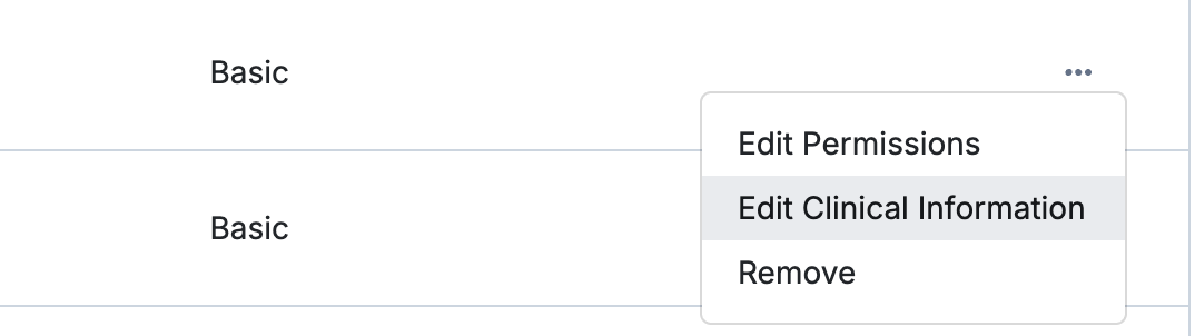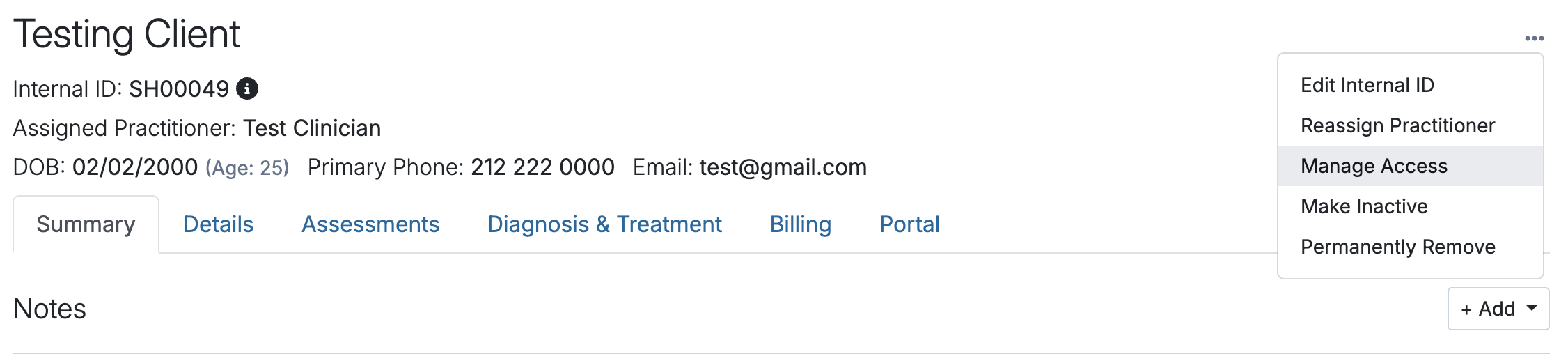 To manage access of a client's record, go to Clients > [Client Name] and click the "..." to view the drop-down options. Choose Manage Access to select other practitioners you'd like to grant access to the client's record.