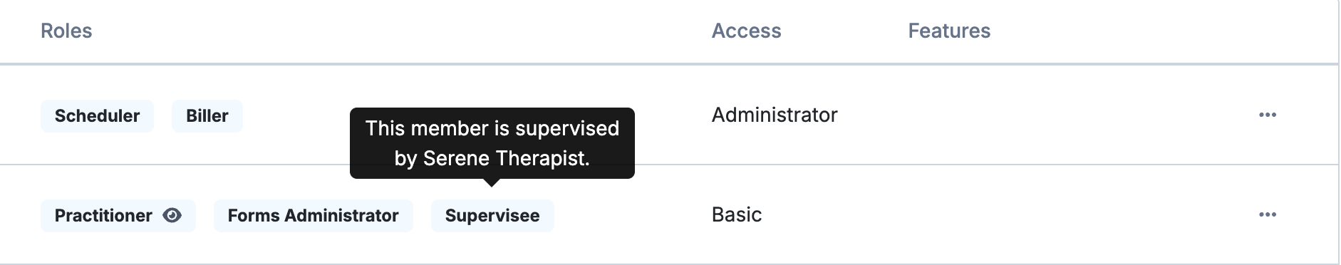 A supervisor role can be assigned to a member of the account who will be supervising another practitioner in the same account. This role allows supervisors to access, review, and co-sign their supervisees’ clients’ progress notes and treatment plans.