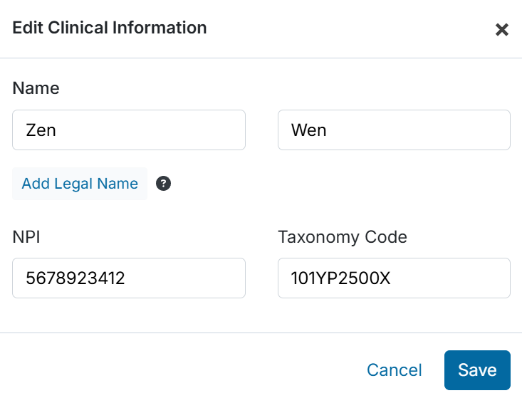 - In the same Edit Clinical Information modal from the previous section, click Add Legal Name.