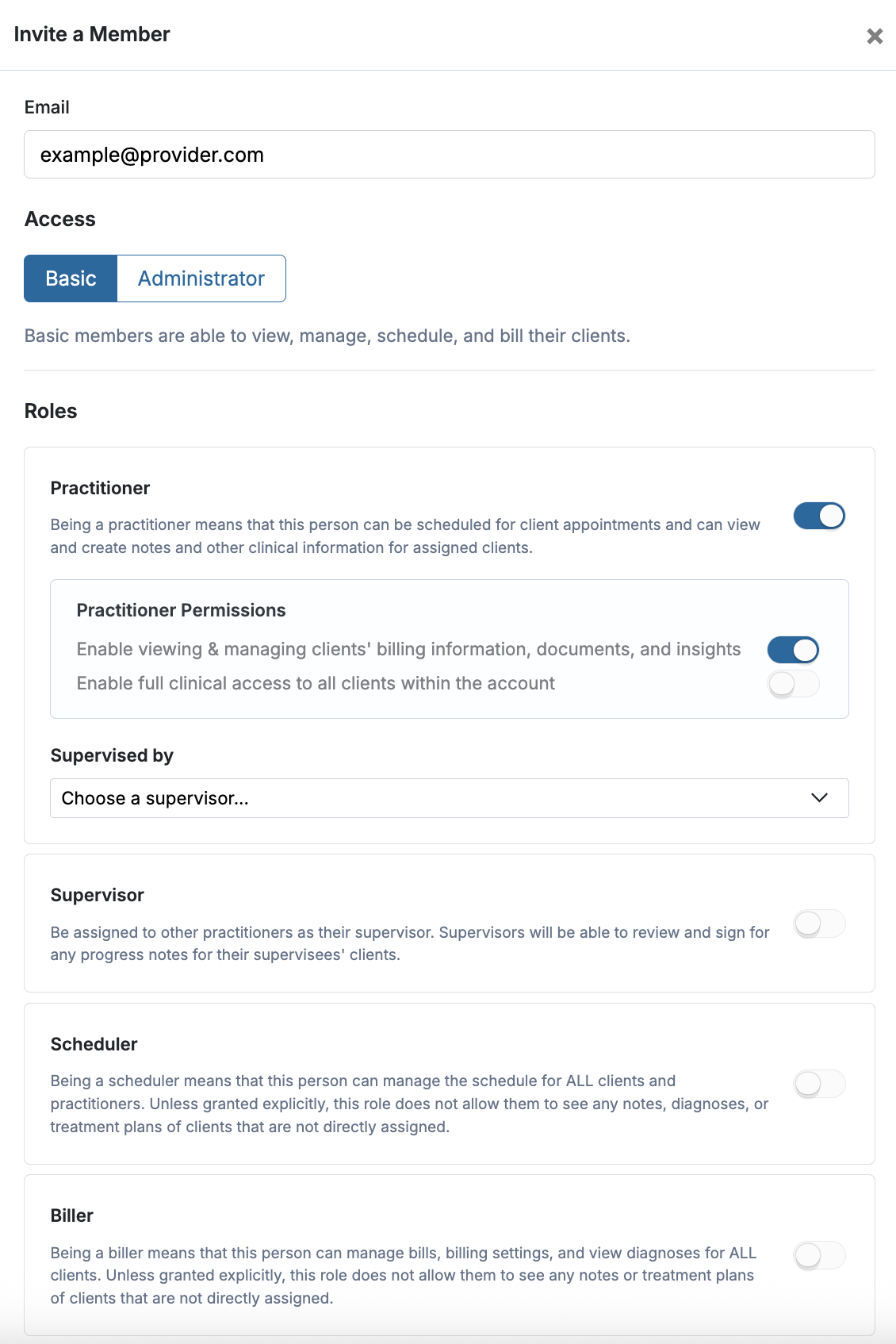 - Enter the member’s email address in the first field shown, then select their role type(s) such as Practitioner, Supervisor, Scheduler, Biller, or a combination based on their access needs.