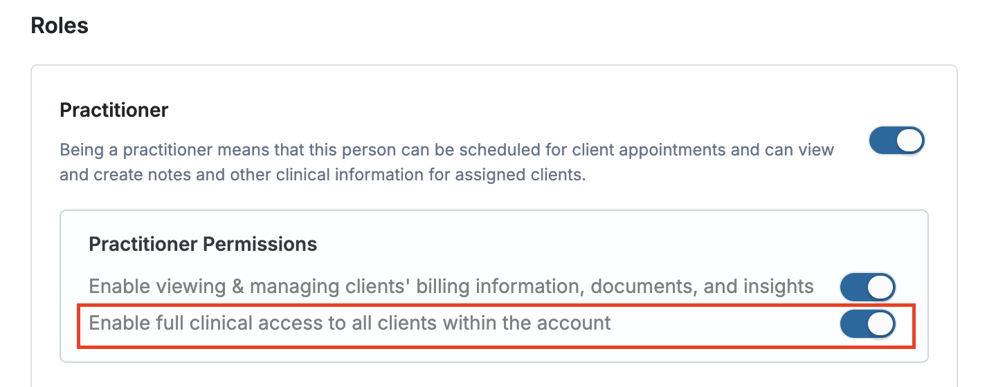 By enabling the “Grant full clinical access to all clients within the account” feature, the practitioner gains permission to view and manage all clients’ clinical documentation within the account. When this permission is turned off, the practitioner will only have access to clients for whom they are the assigned practitioner.