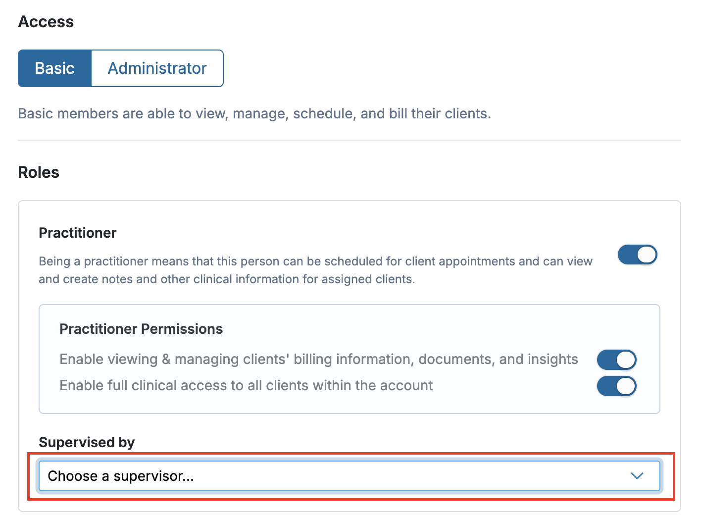 Basic members are able to view, manage, schedule, and bill their clients. Administrators can do everything a Basic Member can do, but can additionally manage all other members of the organization, view and set all organization billing settings, view limited client information for every practitioner within the account, and view all historical invoices for the organization. By default, account administrators are automatically assigned the Forms Administrator access.