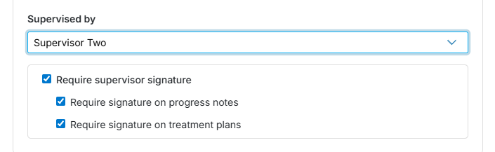 - Next, you can choose the Require supervisor signature setting to specify whether the supervisor’s signature is required on the supervisee’s progress notes, treatment plans, or both by selecting the corresponding checkboxes. To remove the co-signing requirement entirely, uncheck the Require supervisor signature box.