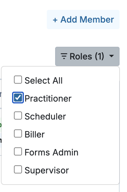 To filter your Members list, click on the filter icon found under the + Add Member button. Here, you can click Select All to view the full members list. To filter by a specific role type, deselect the Select All checkbox and check the desired role type box, such as users with the Practitioner role, as shown below.